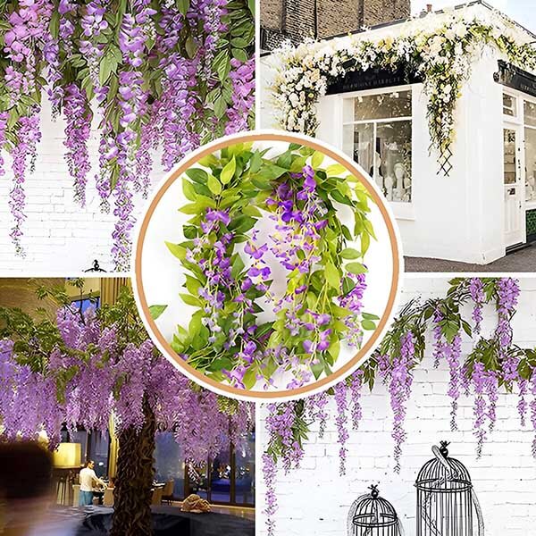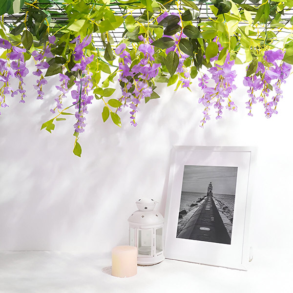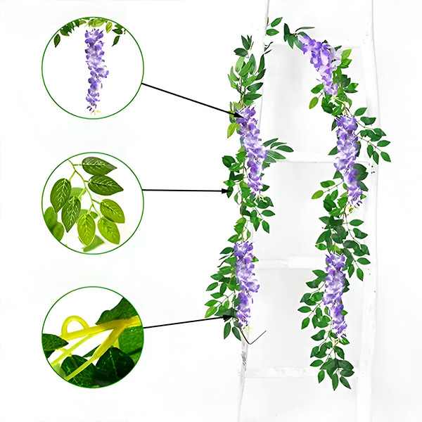 Er du træt af at passe rigtige blomster, der visner og falmer? WISBLOOM er en imitation af glycinblomster med efeublade, som bringer et strejf af naturlig skønhed ind i dit rum uden vedligeholdelse. Disse livlige, naturtro hængeblomster forbliver friske og farverige år efter år og får din have eller dit hjem til altid at se fantastisk ud.